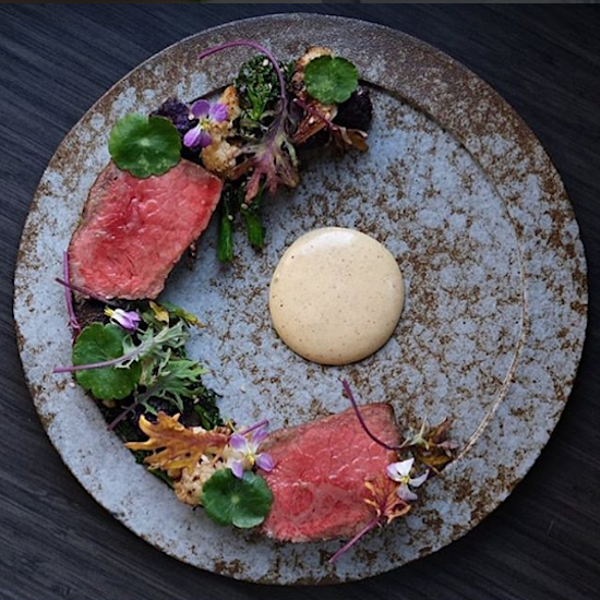 Dry aged beef w/ cauliflower, rapini, furikake, brown butter