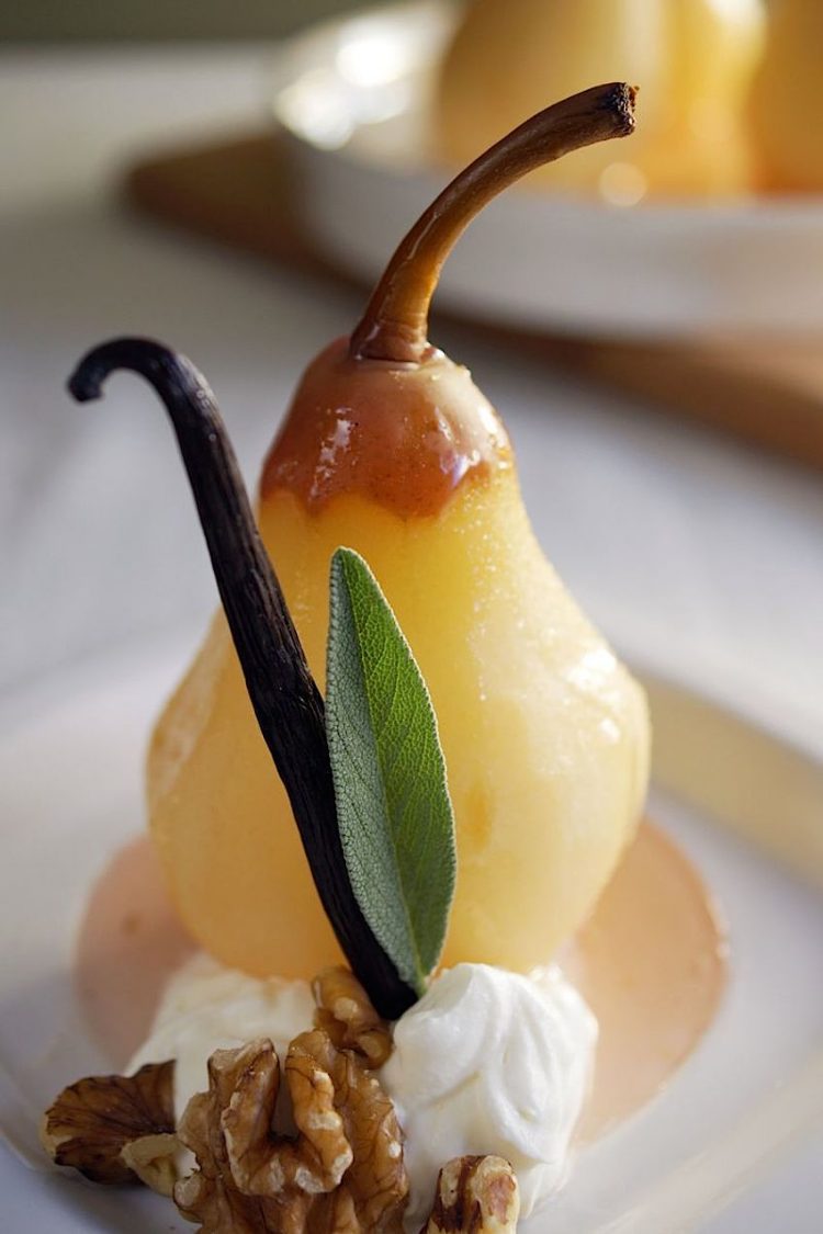 There’s something beautiful about placing a poached pear before someone; that expression of pleasure, the turning of the plate to take in this gourmet delicacy. By combining a medley of enticing flavors such as vanilla, cardamon or muscat wine, paired with a seductive presentation like the beautiful creations below – you will definitely grab his or her attention! Here are three recipes we found that make this point.